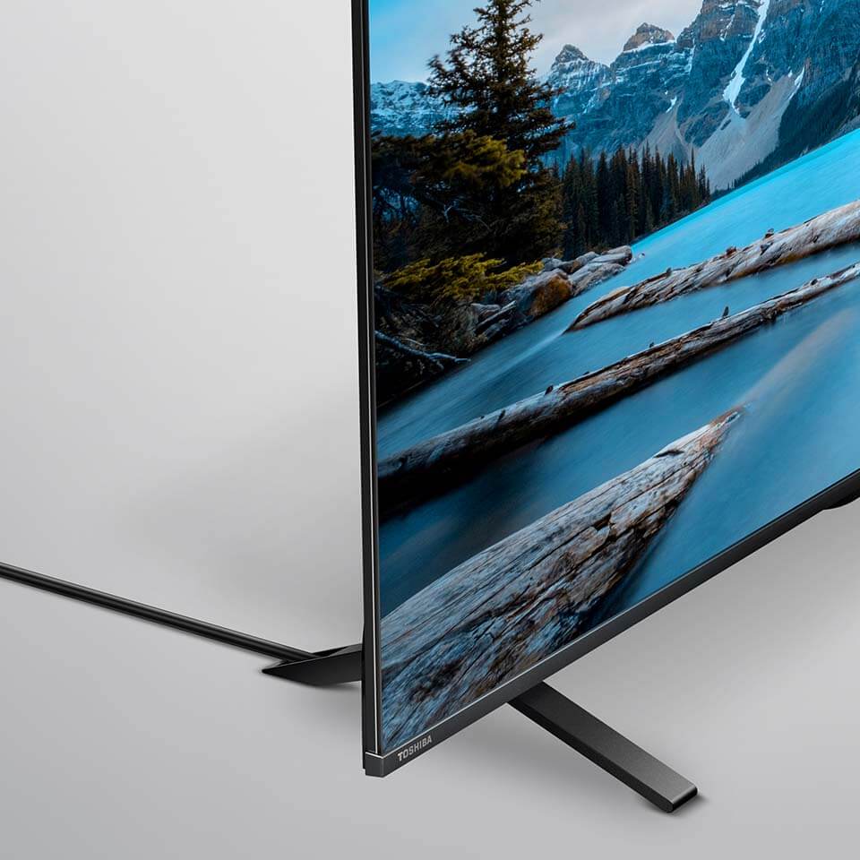 Toshiba TV pursues the philosophy of "Essential Beauty" which is made based on the horizontal and vertical lines in the living space, it makes the living room look stylish by merging into its surroundings.