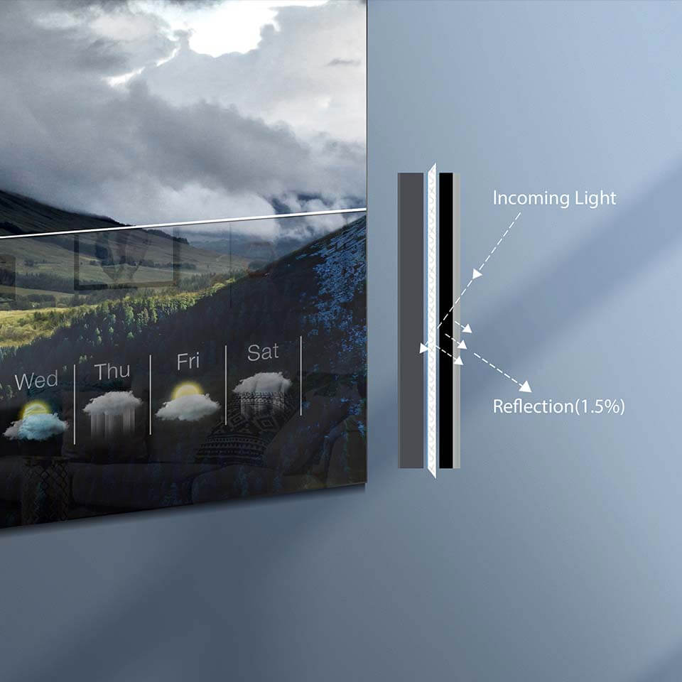 Better visibility from all angles with non-glare panels that minimizes reflection, no matter what time, allowing you to get clear and effortless viewing experience, such as watching stock information, weather, etc.